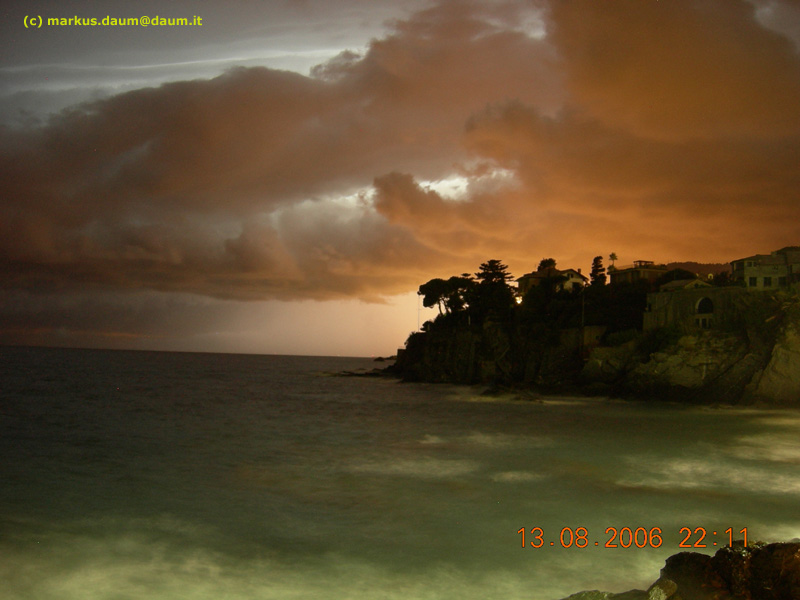 lightning above the clouds (lights of Genoa town render the clouds red)